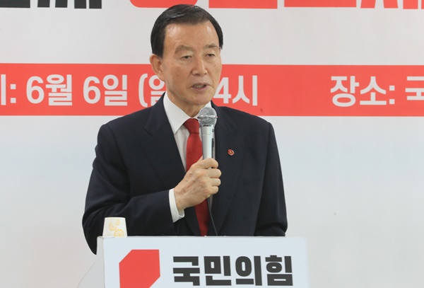 국민의힘 당 대표 선거에 출마한 홍문표 후보가 6일 오후 제주시 연삼로 국민의힘 제주도당사에서 당원들과 간담회를 하고 있다. 연합뉴스