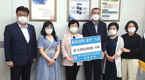 제주중앙여자고등학교 총동창회(회장 이진숙) 임원들은 지난 8일 학교를 방문해 회원들로부터 모금한 장학금 1500만원을 학교발전기금으로 기탁했다.