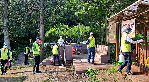 이날 삼의악오름 역사문화 탐방로 일대에 버려진 각종 불법폐기물 수거 등 환경정비와 함께 탐방객 쉼터 편의시설 코로나19 예방 방역활동을 실시했다.