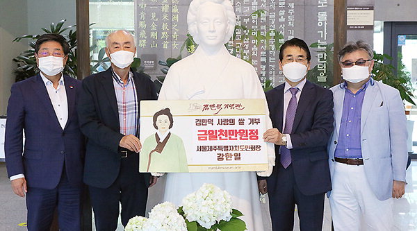 서울제주특별자치도민회(회장 강한일)는 지난 9일 재단법인 김만덕재단(이사장 양원찬)에 사랑의 쌀 기부금 1000만원을 기탁했다. 이날 강한일 회장은 "김만덕 정신을 계승·실천하는 사업에 동참하게 돼 기쁘다"고 말했다.
