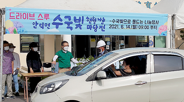 서귀포시 안덕면과 안덕면주민자치위원회(위원장 양재현)는 14일 안덕생활체육관 주차장에서 '안덕면 수국빛 나눔 마당전'을 개최, 수국 키트 700개를 드라이브 스루 방식으로 배포했다.