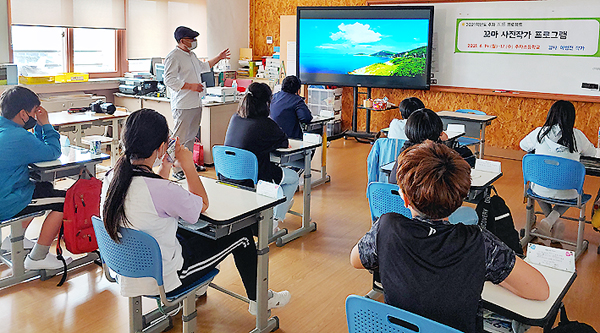 학생들은 추자도 출신으로 추자도를 주제로 작품활동을 하고 있는 이범진 작가와 함께 학년별 2시간씩 사진 촬영 기법을 배우고 학교 주변의 모습을 직접 촬영해 보는 시간을 가졌다.