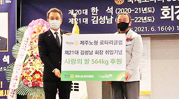 국제로타리 3662지구 제주노형 로타리클럽(회장 김성남)은 지난 16일 메종글래드제주에서 열린 회장 이취임식에서 초록우산 어린이재단 제주지역본부(본부장 김희석)에 사랑의 쌀 564㎏을 전달했다.