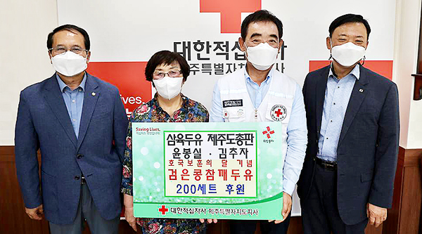 삼육식품 제주도총판(대표 윤봉실·김추자)은 지난 22일 적십자사 회장실에서 대한적십자사제주특별자치도지사(회장 오홍식)에 국가유공자 등 호국 보훈 대상자 지원을 위한 두유 200세트(300만원상당)를 기탁했다.