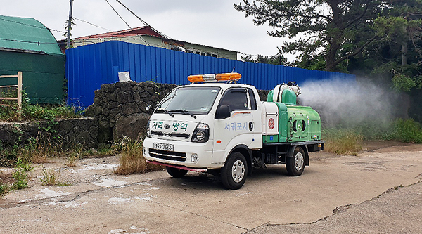 서귀포시 남원읍(읍장 현종시)은 지난 23일 지역 내 양돈농가와 주변 지역을 대상으로 아프리카돼지열병(ASF)을 선제적으로 차단하기 위한 예방 방역을 실시했다.
