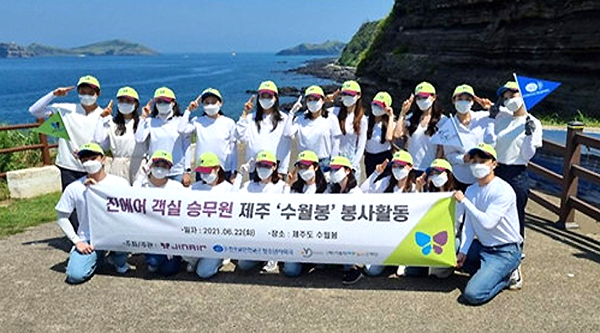 진에어 객실 승무원(부사무장 정단비)과 천주교 인천교구 청소년 사목국(신부 김용수)은 37명이 참여한 가운데 3일간에 걸쳐 수월봉 엉알 해변과 천연보호구역인 차귀도 일원에서 해양쓰레기 정화 봉사활동을 전개했다.