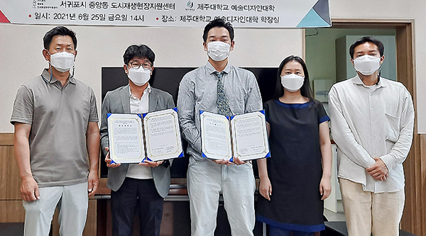 제주대학교 예술디자인대학(학장 강민석)과 서귀포시 중앙동 도시재생현장지원센터(센터장 김동범)는 지난 25일 제주대에서 교육 환경개선과 문화기획학교 운영사업 활성화를 위한 업무협약을 체결했다.