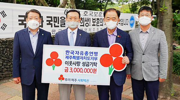 한국자유총연맹제주특별자치도지부(회장 김양옥)는 지난달 28일 지부 사무실 앞에서 성금 300만원을 제주사회복지공동모금회(회장 김남식)에 기탁했다.
