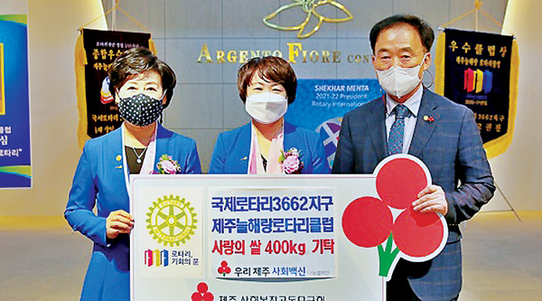 제주늘해랑로타리클럽(취임회장 이경렬·이임회장 이경심)은 최근 아젠토피오레컨벤션에서 회장 및 임원, 이사 이취임식 행사를 갖고, 사랑의 쌀 400㎏를 제주사회복지공동모금회(회장 김남식)에 기탁했다.