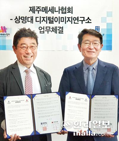 양문석 제주메세나협회 회장(제주상의 회장·사진 오른쪽)과 양종훈 상명대학교 디지털이미지연구소장(대학원 디지털이미지학과 교수·사진 왼쪽)은 지난 1일 제주상공회의소에서 제주 지역 문화진흥을 위한 업무 협약을 체결했다.