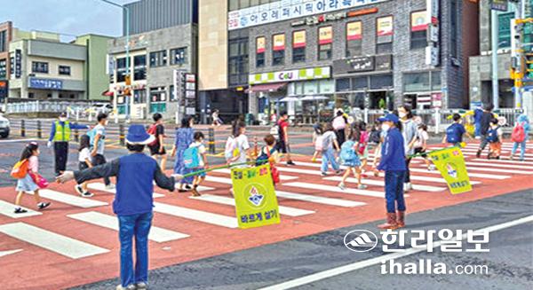 제주시 아라동 바르게살기운동위원회(위원장 김정심)는 5일 아라초등학교 일대에서 보행시 휴대전화 안 보기 등 안전한 등굣길 교통 캠페인 활동을 전개했다.