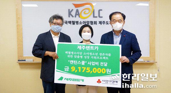 제주렌트카(주)(대표이사 한미경)는 7일 제주시 이도2동 소재 한국백혈병소아암협회 사무실에서 백혈병소아암 소아청소년 생존자를 위한 맞춤형 성장 지원 프로젝트 사업에 사용해 달라며 성금 917만원을 기탁했다.