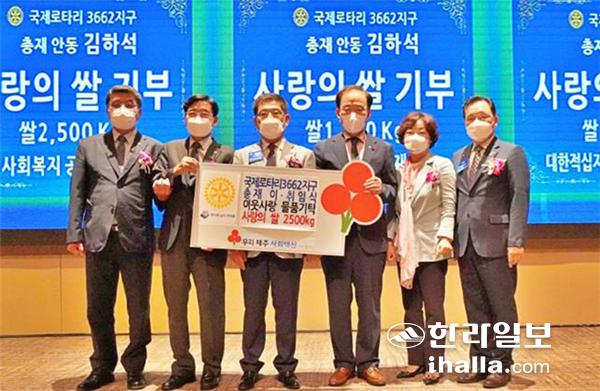 국제로타리3662지구(취임총재 김하석·이임총재 고권진)는 지난 9일 메종글래드 제주에서 총재 이·취임식 행사를 갖고 사랑의 쌀 2500㎏을 제주사회복지공동모금회(회장 김남식)에 기부했다. 이날 기탁된 쌀은 도내 사회복지기관 및 어려운 이웃에 전달될 예정이다.
