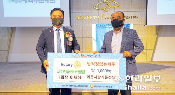 한올로타리클럽(회장 이재성)은 지난 9일 회장 이·취임식 행사에서 '밥 걱정 없는 제주 만들기' 릴레이 기부에 동참하며 제주특별자치도사회복지협의회(회장 고승화)에서 운영하고 있는 제주특별자치도푸드뱅크에 쌀 1000㎏을 전달했다.
