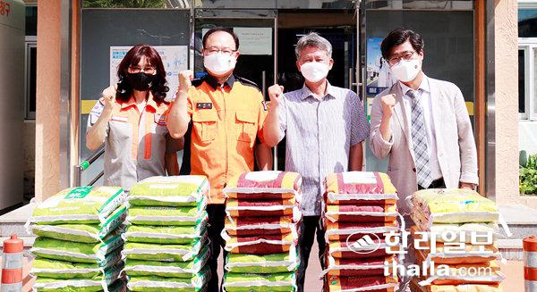 제주소방서는 13일 이도1동 주민센터에 '사랑의 나눔 쌀' 58포(580㎏)를 후원했다.