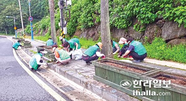 서귀포시 천지동 새마을부녀회(회장 강인삼)는 지난 11일 삼매봉 입구~외돌개 주차장 노선에 대해 하절기 계절화 심기에 앞서 풀베기 작업 및 화단정비 등 환경정비활동을 전개했다.