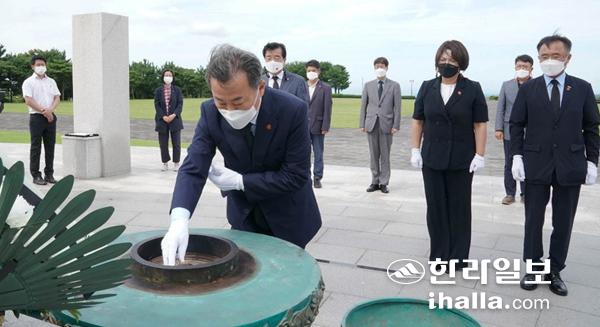 황서종 신임 공무원연금공단 이사장과 김영심 복지본부장은 지난 13일 제주 4·3 평화공원을 찾아 위령제단에 분향·헌화하고 행방불명인 표석 등을 둘러보며 국가 혼란기에 희생된 분들에 대한 추모의 마음을 기렸다.