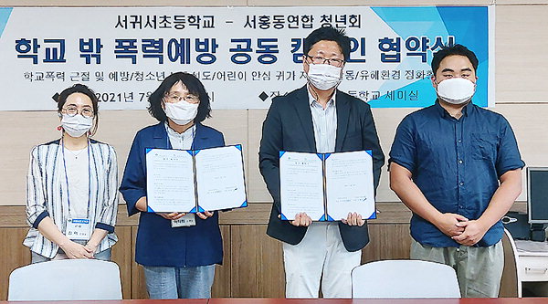 서홍동연합청년회(회장 김법수)는 최근 서홍동 관내 3개학교인 서귀북초등학교(교장 고정희), 서귀서초등학교(교장 허덕희), 서귀포여자중학교(교장 오경규)와'학교 밖 폭력예방 캠페인' 협약을 체결했다.