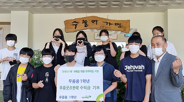 무릉중학교(교장 김희선)는 1학년 16명의 학생들이 자유학기 '마을 탐방'주제 선택활동 수업을 통해 제작한 마을 대표 상품 '무릉굿즈'를 교내 여름 축제 기간에 학생과 교직원에게 판매해 얻은 수익금 전액 44만8600원을 초록우산 어린이 재단에 기부했다고 밝혔다.