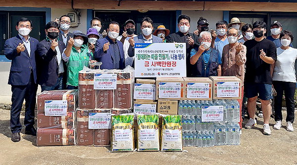 김녕농협(조합장 오충규)과 제주도관광협회(회장 부동석)는 '함께하는 마을 만들기' 일환인 도농교류 활성화 사업으로 지난달 29일 동복리(이장 김병수)에 격려물품을 전달했다. 부동석 회장은 올해 5월 동복리 명예이장으로 위촉됐다.