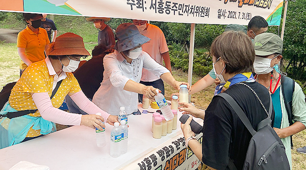 서귀포시 서홍동주민자치위원회(위원장 김수현)는 지난달 31일 변시지그림정원에서 하영올레 3코스 개장맞이 환영 행사로 '수제 쉰다리 나눔행사'를 진행하고 서홍동 명소도 홍보했다. 서홍동 토박이 해설사와 함께 서홍 명소를 탐방하는'서홍동 탐방프로그램'도 운영했다.