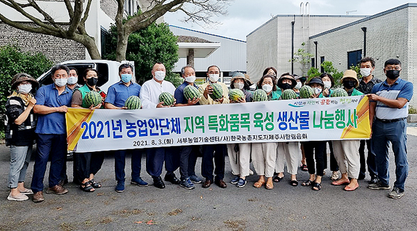 제주도농업기술원 서부농업기술센터(소장 고봉철)와 농촌지도자한림읍회(회장 김상흥)는 지난 3일 취약계층을 돕기 위해 농업인단체 지역특화품목 육성 지원사업으로 생산한 수박 300개를 한림읍사무소에 기부했다.