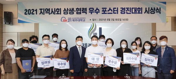 제주대학교는 지난 3일 대학 대회의실에서 4단계BK(두뇌한국)21사업 대학원혁신사업의 일환으로 추진한 '2021 지역사회 상생ㆍ협력 우수 포스터 경진대회 시상식'을 가졌다.