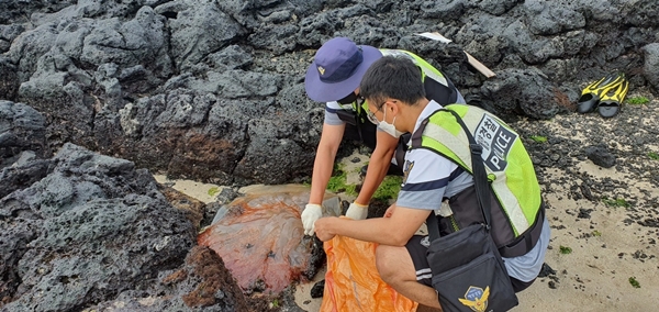 노무라입깃해파리 사체를 수거하고 있는 해양경찰관들. 사진=제주해양경찰서 제공