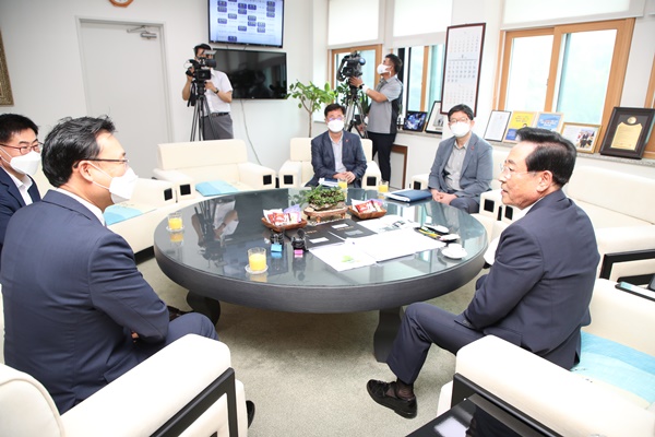 사임 인사차 방문한 고영권 제주 정무부지사와 환담하는 좌남수 의장.