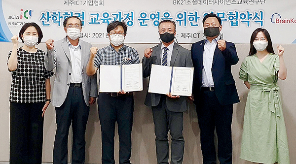 제주ICT기업협회(회장 오태헌)와 제주대학교 4단계 BK21 관광서비스개발과 지역 경제 주체간 갈등 해결을 위한 데이터사이언스 교육연구단(단장 김민철)은 최근 산학교류협력을 통한 공동연구과제 발굴과 인재육성으로 지역사회 발전에 기여하기 위한 업무협약을 체결했다.