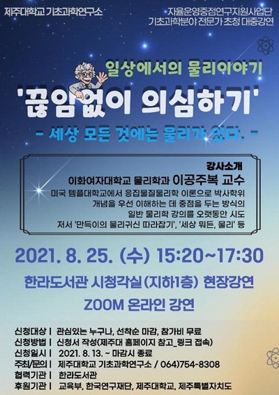 전문가 초청 대중강연은 교육부, 한국연구재단, 제주대, 제주특별자치도의 후원으로 제주대 기초과학연구소가 주관하고 한라도서관이 협력해 이뤄진다. 강연 참가 신청은 제주대 홈페이지를 참조하거나 기초과학연구소(064-754-8308)로 하면 된다.