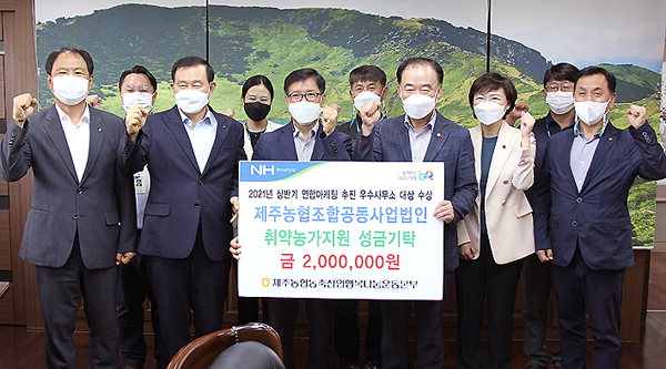 농협제주지역본부(본부장 강승표)와 제주농협조합공동사업법인(대표이사 고성만)은 '2021년 상반기 연합마케팅사업 추진 우수사무소 평가'에서 대상을 수상하며 받은 상금 전액(150만원)에 자체성금을 보태 200만원을 지난 23일 제주사회복지공동모금회(회장 김남식)에 기탁했다. 기탁금은 도내 취약 농업인 지원에 사용될 예정이다.