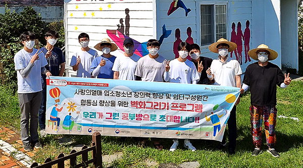 사회복지법인 성안복지재단(대표이사 김경민)이 운영하고 있는 제주시남자중장기청소년쉼터(소장 윤인노)는 지난 8월 초부터 3주간 제주특별자치도사회복지공동모금회 사랑의열매의 지원을 받아 벽화그리기 프로그램을 진행했다. 이번 프로그램은 입소청소년들의 창의력 향상과 함께 쉼터구성원 간의 협동력 향상을 위해 마련됐다.