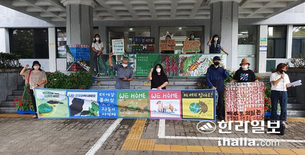 비자림로를 지키기 위해 뭐라도 하려는 사람들 등 제주도내 24개 시민사회단체와 정당은 6일 오전 제주도의회 앞에서 기자회견을 열고 비자림로 확포장공사 결의안을 폐지하라는 구호를 외치고 있다.