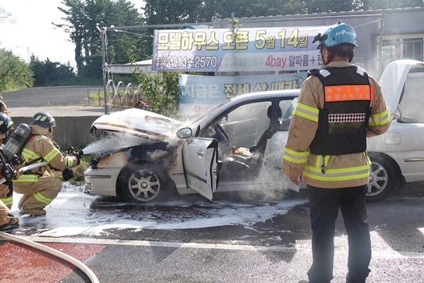 제주시 오라교차로서 그랜저 차량에 화재가 발생해 소방관들이 불을 끄고 있다. 사진=제주소방서 제공
