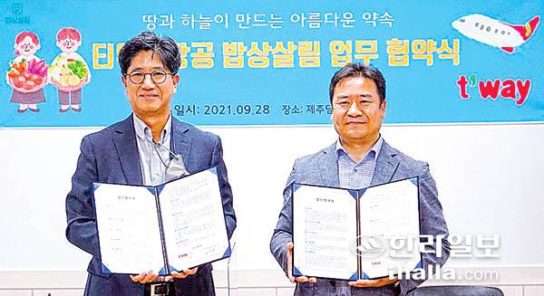 티웨이항공은 지난 28일 제주도 한살림 담을센터에서 밥상살림과 업무 협약을 맺고 로컬 푸드의 판로 개척과 소비 촉진을 위한 공동 마케팅을 추진하기로 했다.