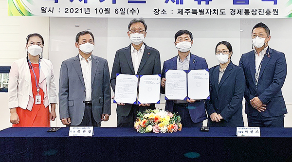 NH농협은행 제주기업지원센터지점(지점장 이상기)은 지난 6일 제주특별자치도 경제통상진흥원(원장 문관영)과 복지카드 발급을 위한 업무협약을 체결했다. 이번 협약은 제주경제통상진흥원 주거래은행인 NH농협이 경제통상진흥원 임직원에게 맞춤형 복지를 제공해 복리증진에 기여하고, 복지예산의 효율적 집행과 체계적 관리를 지원하기 위해 이뤄졌다.