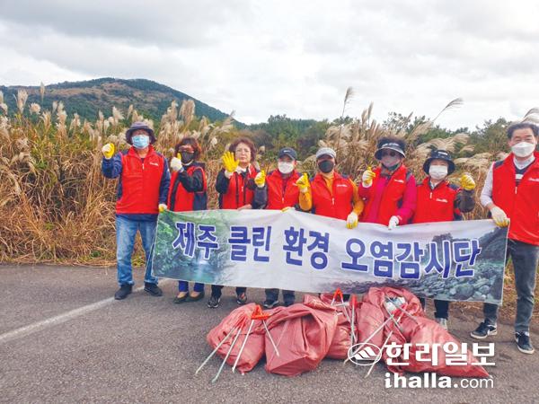 제주클린 환경 오염감시단(대표 고춘자)은 지난달 30일 서귀포시 표선면 정석비행장 주차장 주변에서 방치돼 있는 쓰레기를 수거하는 등 환경 정화를 위한 봉사활동을 펼쳤다.