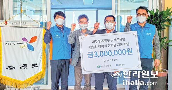 제주에너지공사(사장 황우현)와 제주은행(은행장 서현주) 봉사단은 지난달 29일 제주시 구좌읍 행원리(이장 이일형)를 방문해 기부금 300만원을 재단법인 행원리장학회에 기탁했다.