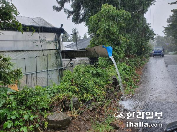 서귀포시지역의 한 비닐하우스에서 빗물이 도로로 유출되고 있다.