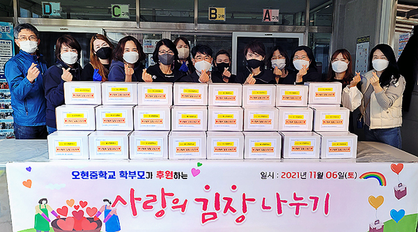 오현중학교 학부모회(회장 문선희)는 지난 6일 지역사회의 어려운 이웃을 위한 '2021 학부모가 후원하는 사랑의 김장 나누기'를 진행했다. 이날 포장된 김치는 제주시 관내 복지기관과 어려운 이웃에게 전달됐다.