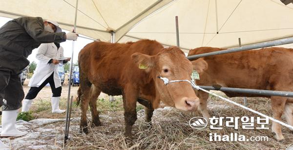 제1회 제주 한·흑우 경진대회가 23일 서귀포시 표선면 조랑말체험공원에서 열려 외모 심사가 진행되고 있다. 이상국기자