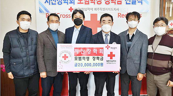 지산장학회(회장 한해성)는 지난 15일 대한적십자사제주특별자치도지사(회장 오홍식)를 방문해 모범학생 27명과 유소년 체육특기생 장학금 및 희망나눔 특별성금 등 2000만원을 전달했다.