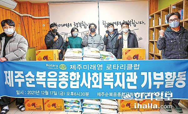 제주미래영 로타리클럽 3662지구(회장 김영민)은 지난 17일 어려움을 겪고 있는 이웃주민을 위해 사용해 달라며 제주순복음종합사회복지관(관장 조영숙)에 200만원 상당의 쌀과 라면을 전달했다.