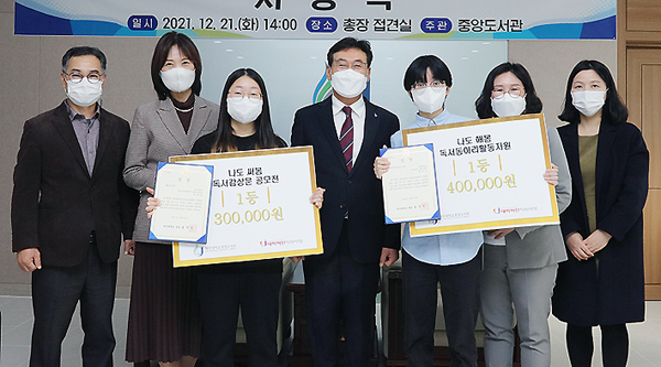 제주대학교(총장 송석언)는 21일 '2021년 JNU 책 읽는 캠퍼스 만들기 프로젝트' 시상식을 가졌다. 총 70명이 참여한 독서감상문 공모전인 '나도 써봄' 부문은 박경아(생물산업학부) 학생이 최우수상을 수상했다. 총 39개 팀이 신청한 독서동아리 활동 프로그램인 '나도 해봄' 부문 최우수상은 '페르소나' 팀(문서경·이유림·김지혜·이유진)이 받았다.
