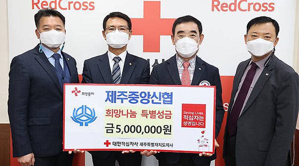 제주중앙신용협동조합(이사장 김태용)은 지난 20일 대한적십자사제주특별자치도지사(회장 오홍식)를 방문해 적십자 인도주의 활동을 위한 희망나눔 특별성금 500만원을 전달했다.