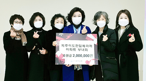 제주이도한일베라체아파트부녀회(회장 김영생)는 지난 17일 사회복지법인 제주공생에 후원금 200만원을 전달했다. 이번 후원금은 지난 11월 부녀회 창립 10주년 기념으로 진행된 '아나바다' 행사로 마련됐다.