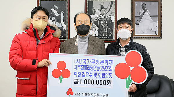 국가무형문화재 제주칠머리당영등굿 예능보유자 김윤수 회장 및 회원들은 최근 도내 어려운 이웃을 돕는 데 사용해 달라며 성금 100만원을 제주사회복지공동모금회(회장 강지언)에 기탁했다.