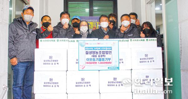 표선면 칠성영농조합법인(대표 송성혁)은 지난 21일 지역 내 어려운 이웃에게 전달해 달라며 '행복나눔 희망뱅크'에 1000만원 상당의 한돈 돼지고기 500㎏(100박스)를 기부했다. 기탁한 물품은 기초생활수급자 등 지역의 어려운 이웃에게 전달됐다.