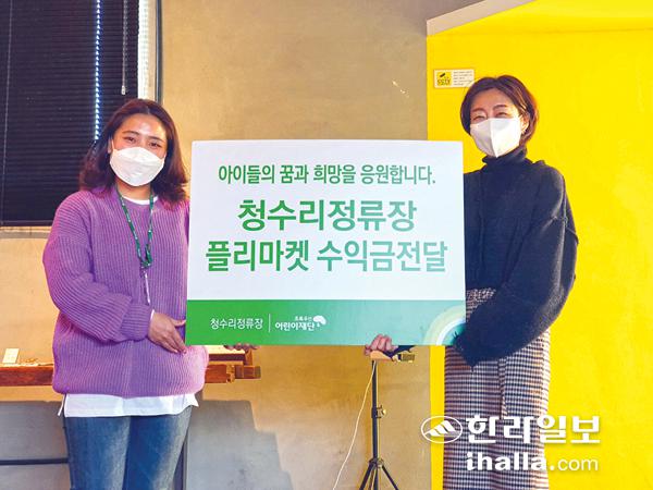 제주를품다(대표 추하늘)는 지난 22일 초록우산 어린이재단 제주지역본부에 청수리 정류장 플리마켓을 진행한 수익금을 후원금으로 전달했다.